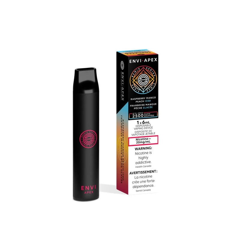 Raspberry Mango Peach Iced - ENVI Apex 2500: Experience the delightful fusion of raspberry, mango, and peach, all finished with an icy coolness. This trio offers a lush, fruity vape with a balance of sweetness and tartness, enhanced by a refreshing icy touch.